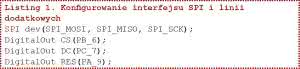 Poza tym, sterownik SSD1306 musi zostać sprzętowo wyzerowany przez wyzerowanie linii RESET. Linie interfejsu SPI, łącznie z linią RESET, należy również zdefiniować. Sposób wykonania konfiguracji sprzętowej pokazano na listingu 1.