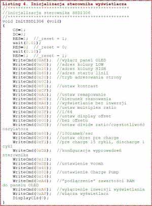 Kompletną funkcję inicjalizacji void InitSSD1306() pokazano na listingu 4. Najpierw jest przeprowadzana sekwencja sprzętowa generująca impuls zerujący o długości 10 ms, ustawiająca bit CS i zerująca DC. Właściwa programowa inicjalizacja zaczyna się od wysłania komendy AE wyłączającej sterowanie matrycą OLED.