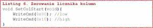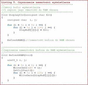 Funkcję czyszczenia wyświetlacza pokazano na listingu 5. Działa ona poprawnie dla trybu adresowania Page Addressing Mode ustawionego w czasie inicjalizacji sterownika. Funkcja void DisplayCls() najpierw zeruje bufor w pamięci mikrokontrolera (dwuwymiarowa tablica), a potem zawartość tego bufora przepisuje do pamięci obrazu RAM sterownika - funkcja RefreshRAM(). Na listingu 6 pokazano procedurę void SetCol-Start() ustawiająca adres kolumny na początek (0x00).