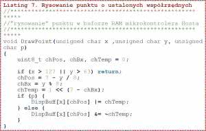 Do rysowania znaków o dowolnej wielkości najlepiej nadaje się funkcja, która potrafizaświecić lub zgasić pojedynczy piksel o dowolnych współrzędnych x, y niezależnych od trybu adresowania. Taką funkcję pokazano na listingu 7.