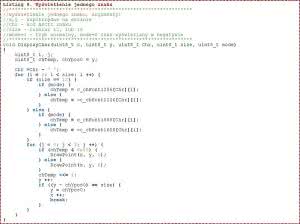 Mając tablicę generatora znaków i procedurę DrawPoint() potrafiącą "zapalać i gasić" bit w buforze pamięci mikrokontrolera odpowiadający zawartości pamięci RAM sterownika, a tym samym odpowiadający pikselowi na matrycy OLED można napisać procedurę "rysującą" znak w pamięci RAM mikrokontrolera. Pamiętamy, że aby ten znak się wyświetlił, trzeba przepisać zawartość DispBuff do pamięci RAM wywołując funkcję void RefreshRAM(). Na listingu 9 pokazano procedurę void DisplayChar() z argumentami: