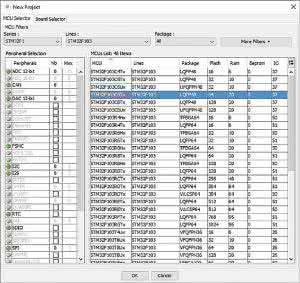 Tworzenie projektu rozpoczynamy od uruchomienia CubeMX i wybrania opcji New Project z ekranu głównego lub z menu. Następnie wybieramy typ mikrokontrolera (rysunek 2) - w naszym wypadku jest to STM32F103C8Tx, po czym klikamy na przycisk OK. Spowoduje to otwarcie w głównym oknie programu zakładki Pinout ( rysunek 3) z widokiem wyprowadzeń mikrokontrolera i panelu konfiguracji peryferiów i oprogramowania.