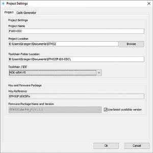 Po kliknięciu na OK, o ile wcześniej nie został zainstalowany w CubeMX pakiet obsługi wybranego typu mikrokontrolera, nastąpi jego ściągnięcie i zainstalowanie. Po uzupełnieniu konfiguracji CubeMX możemy przejść do generowania kodu. W tym celu naciskamy przycisk generowania kodu w pasku narzędzi lub wybieramy z menu opcję Project-Generate Code.
