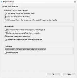 W drugiej zakładce dialogu, Code Generator, możemy ustawić dodatkowe opcje projektu. Jeśli nie planujemy dalszej rozbudowy projektu przy użyciu środowiska CubeMX, wybierając opcję Copy only the necessary library files możemy znacząco zmniejszyć zajętość pamięci masowej przez pliki projektu. Opcja Set all free pins as analog umożliwia ograniczenie poboru mocy i emisji zakłóceń przez mikrokontroler poprzez wyłączenie cyfrowych bloków wejścia-wyjścia na nieużywanych wyprowadzeniach układu.