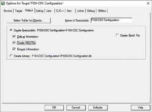 Program Flash Loader Demonstrator obsługuje pliki binarne oraz pliki w formatach Intel, .Hex i S-record. Należy więc skonfigurować środowisko programowania tak, aby wygenerowało ono odpowiedni plik - w Keil MDK-ARM należy w tym celu przed kompilacją zaznaczyć opcję Create HEX file w zakładce Output w dialogu ustawień projektu (rysunek 8).