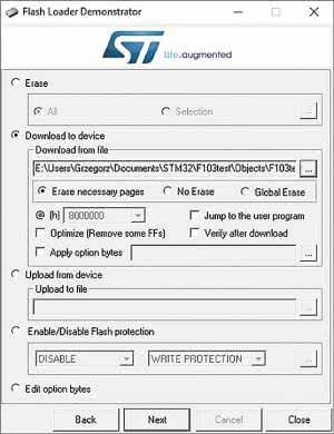 Do programowania mikrokontrolera możemy użyć programu Flash Loader Demonstrator udostępnianego przez ST Microelectronics na witrynie internetowej (plik zawierający program nosi nazwę STSW-MCU005.zip).