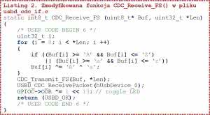 Poza opisaną powyżej poprawką, musimy wprowadzić do pliku usbd_cdc_if.c dwie istotne modyfikacje: