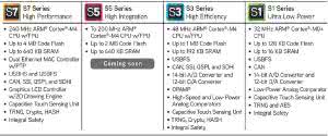 Mikrokontrolery z serii S1 charakteryzują się małym poborem mocy. Wbudowany mechanizm Ultra Low Power pozwala aplikacjom zasilanym bateryjnie na niezwykle długą pracę. Seria S1 jest zbudowana w oparciu o rdzeń Cortex M0+ taktowany z częstotliwością maksymalną 32 MHz.