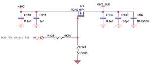 Bluetooth komunikuje się z mikrokontrolerem za pomocą szeregowego interfejsu SCI. Oprócz sterownika na płytce zamontowano wszystkie niezbędne układy pomocnicze, łącznie z anteną. Mikrokontroler modułu ewaluacyjnego może wyłączyć lub włączyć zasilanie interfejsu Bluetooth przez zmianę poziomu logicznego na linii BLE_PWR_EN (P1_13), jak pokazano na rysunku 4.