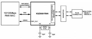 Do tego celu na płytce zamontowano układ KSZ8081 firmy Micrel. Na rysunku 5 pokazano schemat połączenia od złącza RJ45 do układu RMII MAC. Jak wspomniano, w złączu RJ45 umieszczono zintegrowany transformator separujący, a rezystory dopasowujące impedancję ścieżek sygnałowych są w strukturze transcivera KSZ9081.