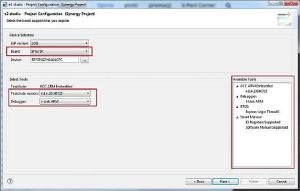 Ponieważ mamy zainstalowany tylko bezpłatny kompilator GCC, to sekcja Select Tools pozostaje z ustawieniami domyślnymi. W oknie Available Tools są wyświetlane dostępne narzędzia dla naszego projektu: kompilator GCC ARM, programator/debugger J-Link ARM, RTOS Express Logic ThreadX, IO Register Supported oraz Software Manual Support.