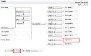 - Clock. Przeznaczona do skonfigurowania systemu taktowania mikrokontrolera. Zakładka jest przedstawiona w formie graficznej, co znacznie ułatwia konfigurowanie taktowania. Jeżeli któreś z ustawień nie jest możliwe do uzyskania, na przykład - taktowanie modułu USB częstotliwością 48 MHz, to ustawienie jest wyświetlane na czerwono, jak na rysunku 18.
