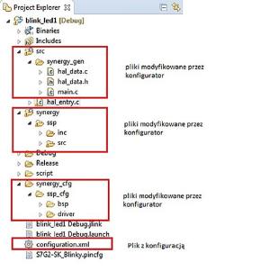 W katalogu synergy_cfg są umieszczone pliki konfigurujące komponenty projektu Synergy. Te konfiguracje bazują na ustawieniach zapisanych w perspektywie Synergy Configuration. Katalog synergy zawiera pliki źródłowe wydzielone z biblioteki SSP przeznaczone dla komponentów aktualnie używanych w projekcie. Konfiguracja tych komponentów jest umieszczona również w katalogu synergy_cfg. Katalog synergy_gen zawiera konfiguracje wcieleń komponentów, które użytkownik dodał do projektu.