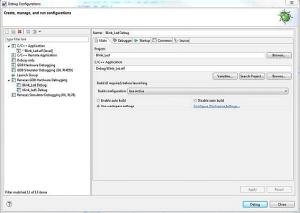 Możemy jako przykład zobaczyć jak wygląda ustawianie taktowania mikrokontrolera wykonywane przez procedurę bsp_clock_init ( listing 5). Ustawienia taktowania są zapisane w pliku bsp_clock_cfg.h (listing 6). Istnieje też możliwość debugowania konfiguracji projektu. Zamiast Debug As klikamy na Debug Configurations i w nim na zakładkę Debug (rysunek 27). Po kliknięciu na przycisk Debug jest wyświetlane okno z plikiem startup_S7G2.c (rysunku 28).