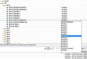Najpierw konfigurujemy przerwania od GPT0 zgłaszane przy przepełnieniu licznika (rysunek 29). Potem we właściwościach licznika (zakładka Threads) wpisujemy: Period value=1, Period unit = seconds, Callback = user_gpt_callback (rysunek 30).