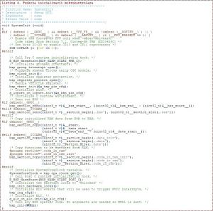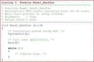 Teraz możemy zobaczyć jak się wykonuje nasz program z listingu 2. Wskaźnik rozkazów nie zatrzymuje się na wywołaniu pierwszej procedury z funkcji main(), ale na pierwszej procedurze funkcji Reset_Handler(), którą pokazano na listingu 3. Jak się łatwo domyślić, jest to funkcja wywoływana po zerowaniu mikrokontrolera i to dopiero ona wywołuje funkcję główną main(). Jednak zanim to nastąpi, wywoływana jest funkcja System Init() umieszczona w pliku startup_S7G2.c (listingu 4).