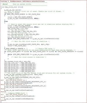 Zgodnie z przewidywaniami inicjalizacja jest dość rozbudowana i zawiera procedury ustawiające między innymi taktowanie, system przerwań, protekcję zapisu rejestrów, inicjowanie linii GPIO itp. Każdą z funkcji inicjalizujących można w debugerze wykonywać krokowo i posiłkując się dokumentacją mikrokontrolera patrzeć jak postępuje konfigurowanie mikrokontrolera.