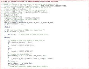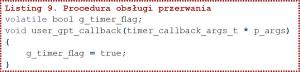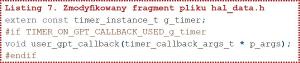 A w pliku hal_data.c konfigurator dopisał definicję konfiguracji licznika (listing 8). Teraz pozostaje napisać tylko procedurę user_gpr_callback wywoływaną przy każdym zgłoszeniu przerwania od licznika GPT. Tę procedurę możemy umieścić tylko w pliku hal_entry.c, jak pokazano na listingu 9. Zmodyfikowana pętla cyklicznie gasząca i zapalająca diody LED na module ewaluacyjnym pokazano na listingu 10.