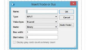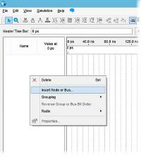 Jak widać jest ono puste, musimy wprowadzić do opisu symulacji wszystkie linie wejściowe i wyjściowe oraz sygnały (węzły) wewnętrzne, których działanie chcemy uwzględnić w testach. W tym celu stajemy myszką w lewej części okna edytora i klikamy prawym przyciskiem myszy, co spowoduje wyświetlenie menu kontekstowego (rysunek 3), z którego wybieramy opcję Insert Node or Bus..., co spowoduje wyświetlenie okna pokazanego na rysunku 4.