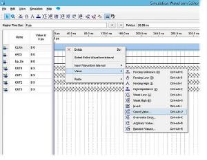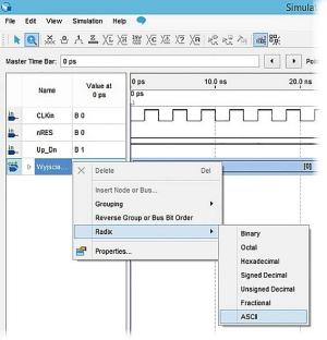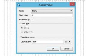 Z wyświetlonego menu kontekstowego wybieramy opcje Value → Count Value (rysunek 10), co spowoduje wyświetlenie okna edycji przebiegu zegarowego, które pokazano na rysunku 11. W pozycji Transitions Occur można zdefiniować odstępy czasowe pomiędzy zboczami sygnału zegarowego (dla wartości 10 ns okres przebiegu wynosi 20 ns).