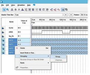 Edytor przebiegów wyposażono w kilka mechanizmów, które ułatwiają przygotowanie symulacji projektów o większej niż w przykładzie liczbie analizowanych wejść i wyjść. Można na przykład grupować wybrane linie w magistrale (rysunki 15 i 16), można także zmieniać format wyświetlanych wartości w zależności od indywidualnych potrzeb (rysunek 17).