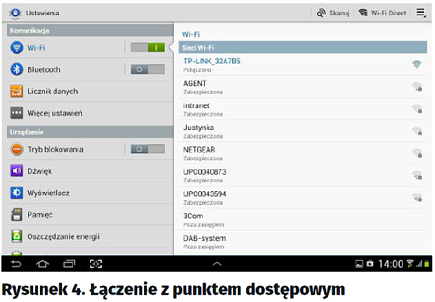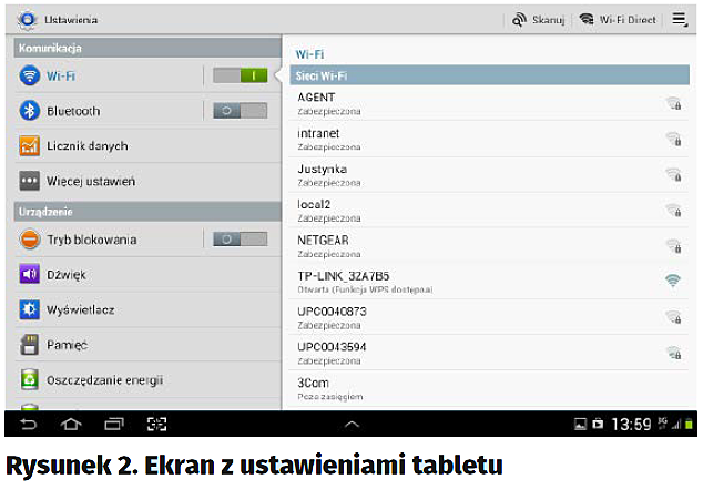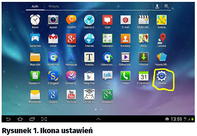 Elementem sieci, który pozostał do omówienia, jest access point lub router Wi-Fi. Dla potrzeb kursu użyłem access pointa firmy TP-Link typu TL-WA701ND. Jeśli zastosujemy ten model, to praktycznie nie będziemy go musieli konfigurować, chociaż warto będzie poczynić pewne zmiany w stosunku do ustawień fabrycznych. Ale na razie spróbujmy nawiązać połączenie pomiędzy tabletem a punktem dostępowym. Dotknijmy ikonę Ustawienia (rysunek 1) – zostanie wyświetlony obraz jak na rysunku 2.