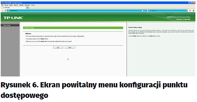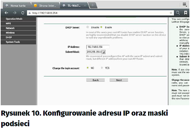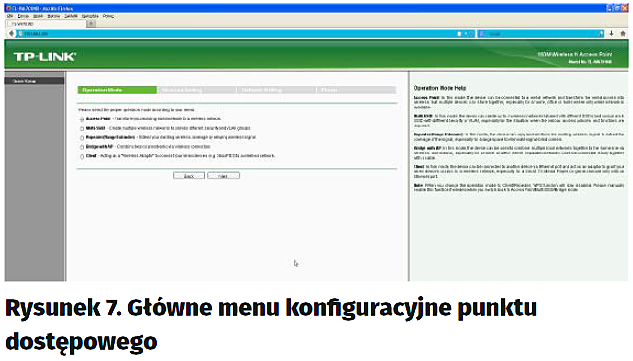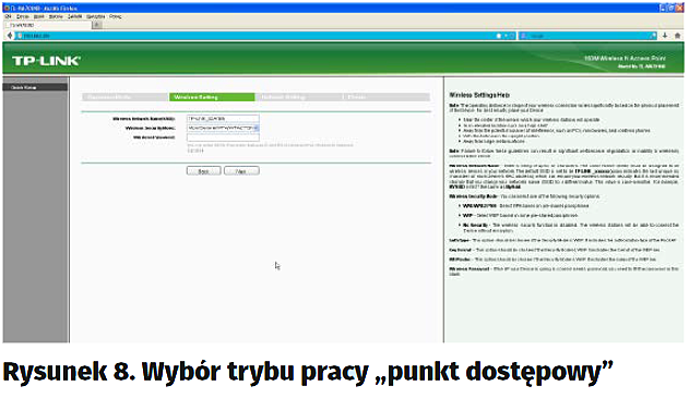 Do wyboru mamy różne tryby pracy urządzenia. Ponieważ potrzebujemy, aby pracowało ono jako punkt dostępowy, zaznaczamy „Access Point” i klikamy Next (rysunek 8). Na tej karcie zdefiniujemy sobie nazwę sieci na taką, którą będziemy mogli łatwo zidentyfikować. Czyli w miejsce „TP-LINK_32A7B5” wpisujemy swoją, np. „Moje DMX512”, następnie wpiszmy hasło, np. „12345678”, jak na rysunku 9.