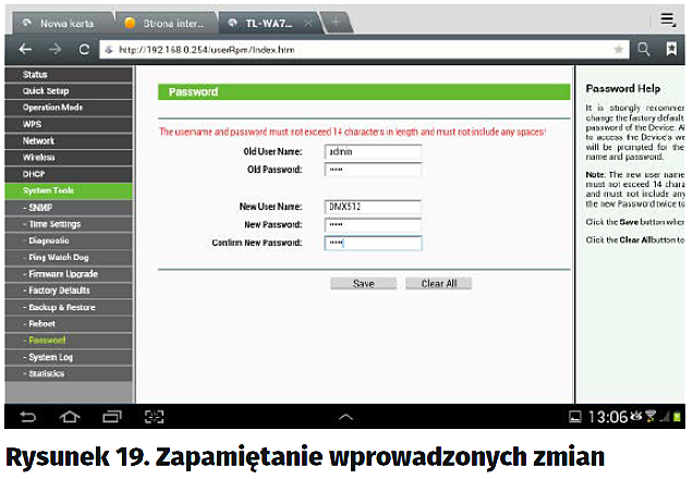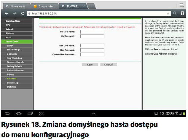 Jeśli chcemy uzyskać szczegółowe informacje, dotknijmy nazwy sieci – wówczas zostaną wyświetlone szczegóły (rysunek 17). Wejdźmy jeszcze raz do ustawień punktu dostępowego i zmieńmy domyślne hasło dostępu do konfiguracji. Z lewej strony mamy menu, z którego wybieramy „System Tools”, a następnie „Password”, jak na rysunku 18. W odpowiednie rubryki wpisujemy dotychczasowy login i hasło (admin, admin), następnie nową nazwę użytkownika oraz nowe hasło i poniżej jego powtórzenie. Zapisujemy ustawienia, klikając w „Save” (rysunek 19).