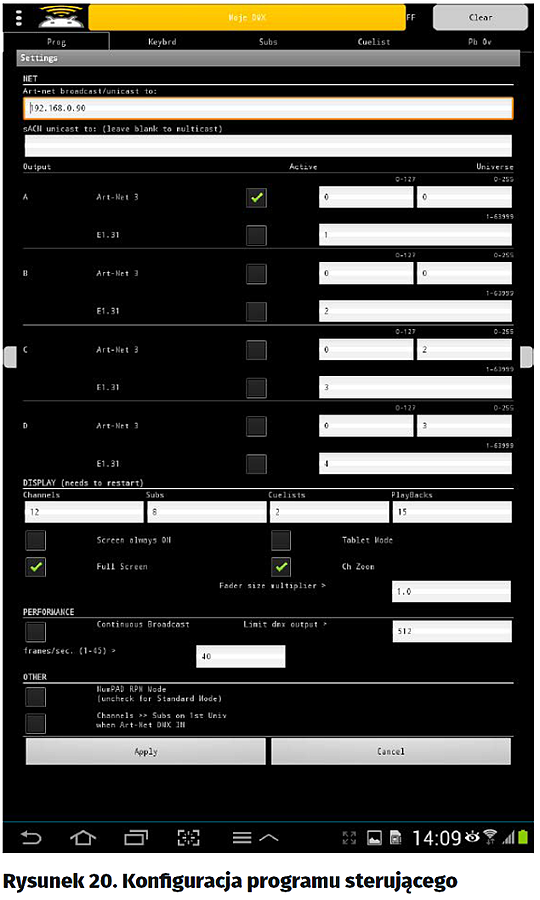 − „Continuous Broadcast” załącza rozsiewczy tryb transmisji danych polegający na wysyłaniu przez kanał informacyjny pakietów, które powinny być odebrane przez wszystkie pozostałe porty przyłączone do danej sieci (domeny broadcastowej). To ogólna definicja, a co oznacza w naszym przypadku? Jeśli zaznaczymy ten parametr, to pakiety DMX będą wysyłane przez program w sposób ciągły, niezależnie od tego, czy wartość któregokolwiek kanału uległa zmianie, czy też nie. Przy odznaczonej opcji pakiety zostaną wysłane (odnowione) tylko w przypadku zmiany wartości dowolnego kanału DMX. A co to oznacza w praktyce dla nas? Przypuśćmy, że dokonaliśmy zmian wartości kanałów DMX na tablecie, jednak z jakichś powodów informacja ta nie została odebrana przez Art_Net_Node np. z powodu chwilowego braku zasilania. Po powrocie zasilania przy aktywnej opcji Broadcast wszystkie zmiany wartości poszczególnych kanałów zostaną odświeżone, a przy wyłączonej zostaną uaktualnione dopiero wówczas, gdy dokonamy zmiany w którymś z kanałów DMX.