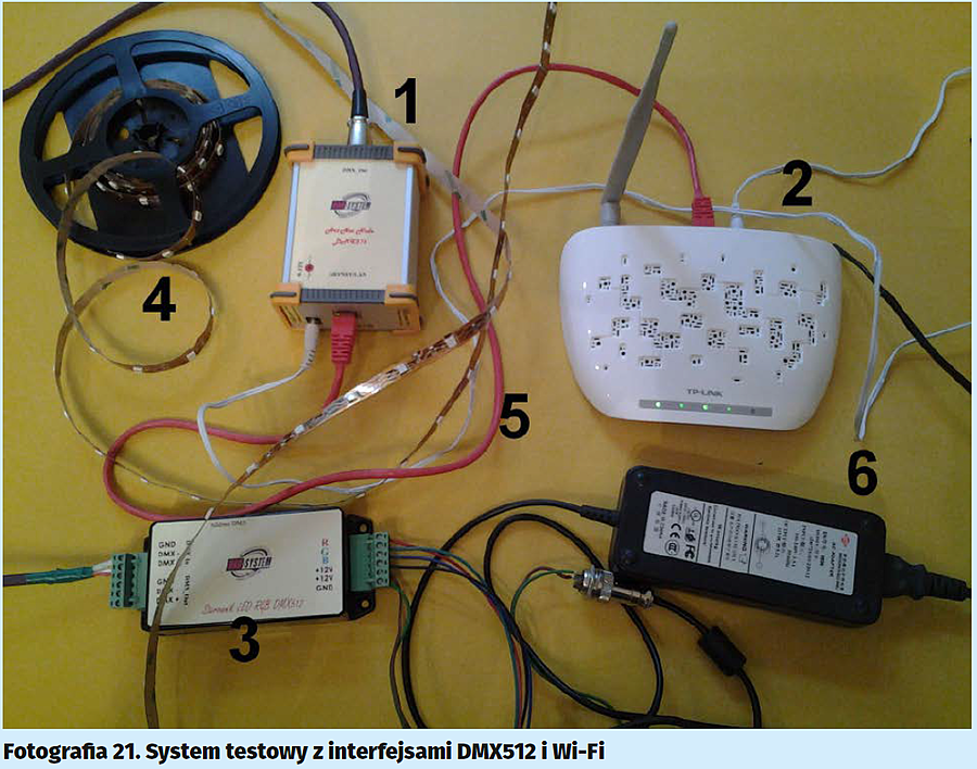 Mamy już wszystko, co jest nam potrzebne do wstępnego uruchomienia systemu sterowania. A co najważniejsze – należy nam się jakaś nagroda za wyczerpującą pracę przy konfiguracjach, więc spróbujmy wysterować jakieś urządzenie DMX, a przy okazji przetestujemy, czy wszystko zostało wykonane poprawnie. Zmontujmy system sterowania na razie na stole – w ten sposób będziemy mieli wszystkie komponenty w zasięgu ręki i wzroku. Gotowy system testowy zaprezentowano na fotografii 21. Zawiera on: