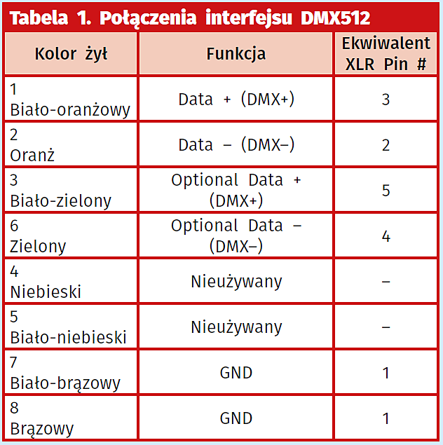 Powyższe złącza typu XLR stosuje się przeważnie w mobilnych instalacjach, które często są montowane i demontowane. W przypadku stałych instalacji, to jest takich, które praktycznie nie będą demontowane lub taka konieczność będzie sporadyczna, jako przewody stosuje się skrętkę komputerową kat. V zakończoną wtykami typu RJ-45. Przewód kat. V jest dostępny w wykonaniu skrętki ekranowanej (STP) oraz nieekranowanej (UTP), jego parametry przewyższają wymagania stawiane dla standardu DMX512. Wówczas połączenie należy wykonać zgodnie z tabelą 1.