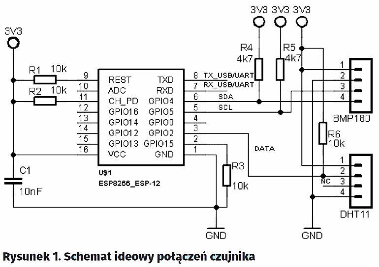 Schemat ideowy połączeń czujnika pokazano na rysunku 1. Zastosowane układy DHT11 oraz BMP180 pozwalają na odczyt podstawowych parametrów otoczenia. Są to łatwo dostępne i tanie części, przez co mają pewne ograniczenia. W wypadku DHT11 jest możliwe użycie „brata”, czyli DHT22 – układu o lepszych parametrach. Są one kompatybilne pod względem rozmieszczenia wyprowadzeń. Należy jedynie zmienić typ czujnika w kodzie programu. Podstawowe parametry sensorów wymieniono w ramce.