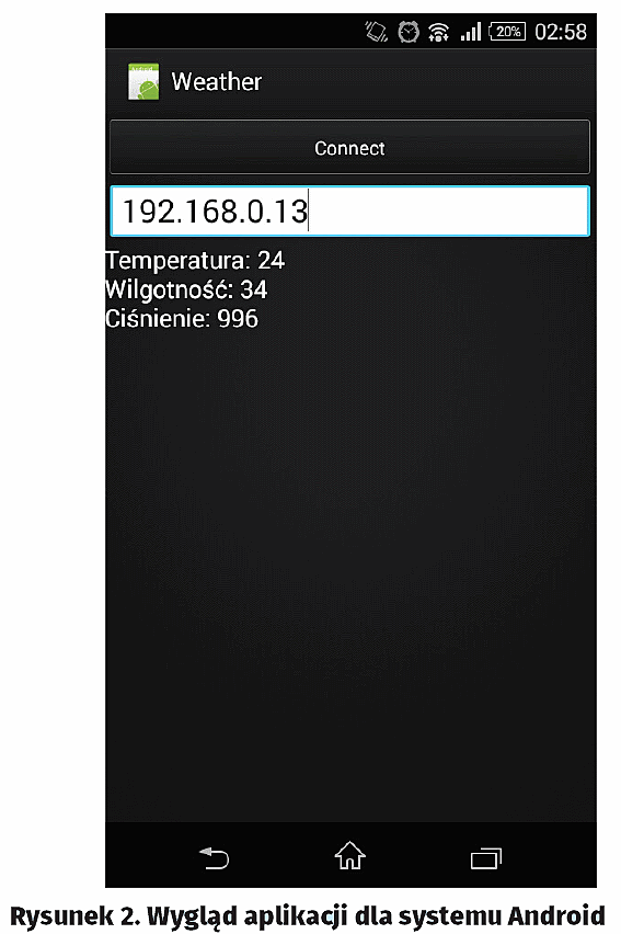 Sama aplikacja jest nieskomplikowana i wykonana specjalnie na potrzeby tego artykułu (rysunek 2). Pokazuje tylko jak łatwo wykorzystać telefon jako centrum domowego systemu pomiarowego. Po lekkich modyfikacjach, aplikacja mogła by odczytywać takie wartości jak, stan czujek alarmowych, ilość domowników, parametry otoczenia, stany lamp oraz włączonych urządzeń.