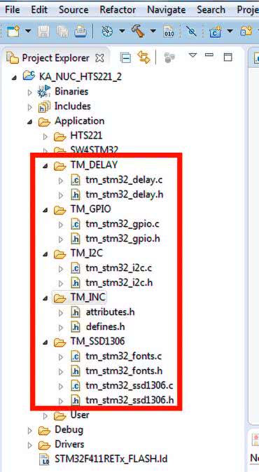 Zamiast pisać samodzielnie procedury obsługi wyświetlacza, skorzystamy z gotowych procedur znajdujących się w plikach STM32_LIBRARIES.zip. Najpierw należy rozpakować bibliotekę w wybranym katalogu. Przeglądając jej zawartość znajdziemy interesujące nas pliki (tm_stm32_ssd1306.h i tm_stm32_ssd1306.c). Aby móc posłużyć się funkcjami obsługi wyświetlacza należy najpierw je zaimportować do utworzonego projektu programu. Potrzebny będzie także import kilku dodatkowych plików z biblioteki. Można to zrobić w następujący sposób: