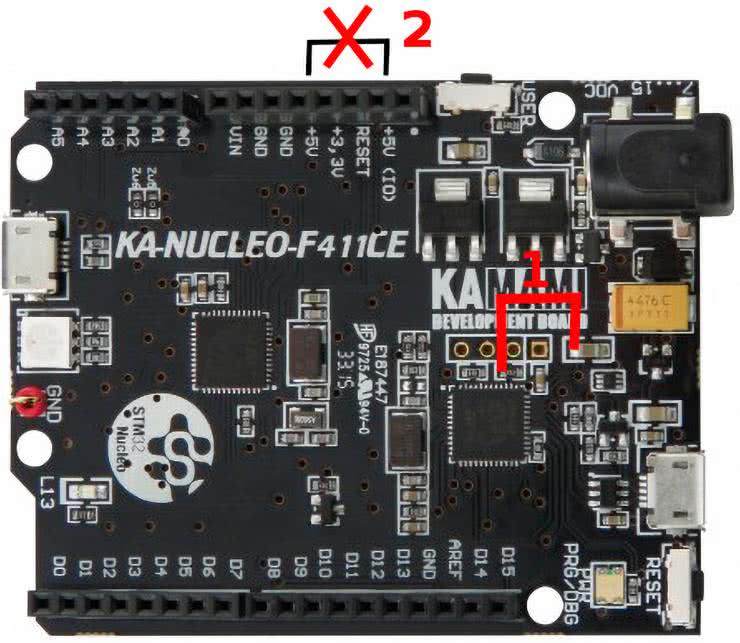 Przecinana ścieżka znajduje się na górnej części płytki drukowanej pomiędzy złączem a krawędzią. Do normalnej pracy płytka KA-NUCLEO-F411CE potrzebuje stałego połączenia z interfejsem USB komputera PC. Jej autonomiczna praca jest jednak możliwa. Należy tylko wlutować zworę zaznaczoną na rysunku 5 kolorem czerwonym i cyfrą „1”.
