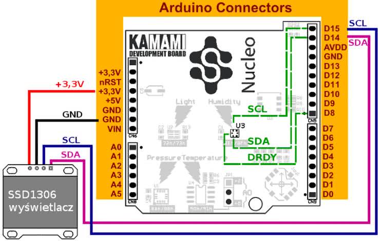 Na rysunku 2 pokazano schemat połączeń wykonanych pomiędzy gniazdami a czujnikiem i wyświetlaczem. Zielonymi liniami przerywanymi zaznaczono połączenia pomiędzy zamontowanym na płytce KA-NUCLEO-Weather czujnikiem HTS221 i wyprowadzeniami na złączach. Do tych samych wyprowadzeń magistrali I²C, do których przyłączono czujnik, doprowadzone są przewody linii SCL i SDA wyświetlacza. Dodatkowo, wyświetlacz jest przyłączony do masy GND i pobiera napięcie zasilania z jednego z dostępnych wyprowadzeń +3,3 V. Zasilanie czujnika jest poprowadzone na płytce KA-NUCLEO-Weather i na rysunku nie zostało zaznaczone. Dodatkowa linia DRDY połączona z wyjściem D8 na złączu Arduino, służy do sygnalizowania gotowości czujnika do odczytu danych kolejnego pomiaru wilgotności i temperatury. Na płytce KA-NUCLEO-Weather zamontowano obowiązkowe dla interfejsu I²C rezystory zasilające linie SCL i SDA.
