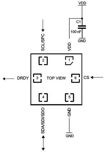 Miniaturowa obudowa HTS221 ma 5 wyprowadzeń umieszczonych na spodzie. Ich rozmieszczenie w widoku z góry pokazano na rysunku 1. Czujnik stanowi kompletny system, a jego obudowa zawiera wszystkie niezbędne bloki funkcjonalne. Jedynym dodatkowym komponentem zewnętrznym wymaganym przez jego aplikację jest kondensator o pojemności 100 nF filtrujący napięcie zasilające, który powinien być dołączony możliwie blisko doprowadzenia napięcia zasilającego. Interfejs komunikacyjny wybiera się za pomocą poziomu logicznego na wejściu CS. Logiczna „1” uaktywnia interfejs I²C, natomiast logiczne „0” – SPI. Szczegółowe informacje techniczne czujnika, dostępne są na stronie internetowej producenta pod adresem www.st.com.