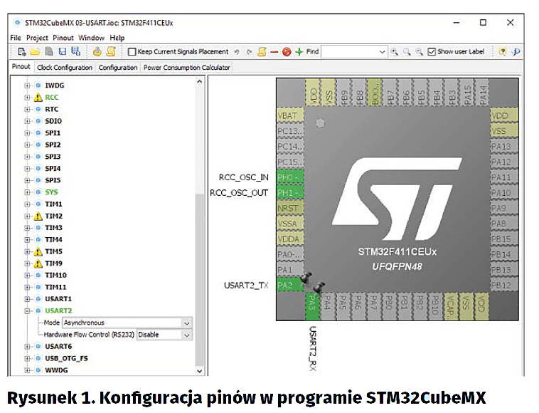 <–>USB wbudowany programator, używane przez nas wyprowadzenia to: PA2 w roli pinu nadawczego i PA3 w roli pinu odbiorczego. Jeśli korzystamy z innej płytki lub chcemy przyłączyć adapter USB albo układ MAX232 do wyprowadzeń płytki, musimy wyszukać wyprowadzeń w jej datasheecie. Z poziomu STM32CubeMX możemy natomiast sprawdzić, na których pinach układu można uruchomić interfejs – klikamy w tym celu lewym przyciskiem myszy na piny i szukamy funkcji alternatywnej o nazwie „USARTx_TX” lub „USARTx_RX”. Gdy chcemy ustawić wybrane piny, wybieramy z menu te funkcje. Do działania interfejsu UART potrzebujemy pinu TX oraz RX. Dla interfejsu USRT, dodatkowo pinu CK – zegara.