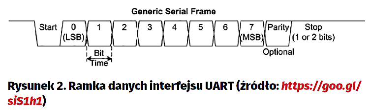 Wspomniałem już o interfejsach UART i USART. Czym jednak się one różnią? Interfejs UART jest interfejsem asynchronicznym, co oznacza, że urządzenia po obu stronach mogą zacząć nadawać w dowolnej chwili i nie wymieniają się sygnałem zegara. UART wykorzystuje jedynie dwa wyprowadzenia – jedno nadawcze, a drugie odbiorcze (łącząc układy należy jeszcze pamiętać o połączeniu ich mas). Interfejs USRT – oprócz sygnałów nadawczego i odbiorczego – wysyła również przebieg zegarowy określający jasno, w których momentach transmitowane są poszczególne bity. Jest on łatwiejszy w implementacji sprzętowej i zabezpiecza nas przed rozsynchronizowaniem się transmisji przy jej większych prędkościach, jednak używa dodatkowego wyprowadzenia.