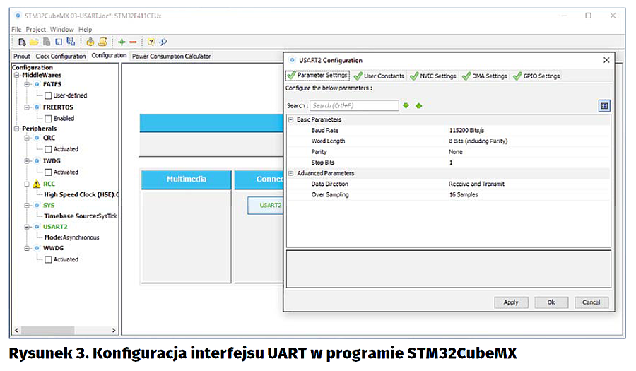 Dalej, przechodzimy do zakładki Configuration. W polu Connectivity pojawił się nowy interfejs USART. U mnie – USART2. Aby go skonfigurować, klikamy przycisk USARTx. Możemy teraz ustawić szybkość nadawania i odbioru, a także inne parametry przesyłanych ramek danych. Popularnymi szybkościami pracy są 115200 bps oraz 9600 bps. Jeśli chcemy sterować układem, który ma interfejs USART, powinniśmy sprawdzić, jaką szybkość ustawić w datasheecie tego układu. Podobnie ma się sprawa z liczbą bitów stopu i także bitem parzystości.