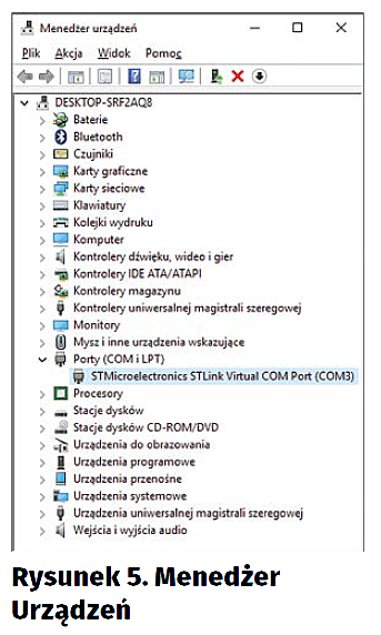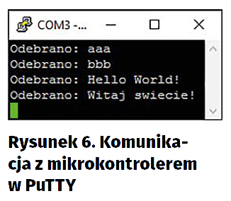 Teraz możemy skompilować kod i wgrać go na układ (ikony młotka i robaka na pasku menu) oraz uruchomić program PuTTY i „porozmawiać” z mikrokontrolerem. W oknie programu PuTTY, w polu Connection Type wybieramy opcję Serial, w polu Speed wpisujemy wybraną szybkość połączenia (domyślnie 115200 bps). W polu Serial line podajemy nazwę portu szeregowego – rysunek 4. Tą ostatnią poznamy w systemowym Menadżerze Urządzeń (rysunek 5), w sekcji Porty (COM i LPT), pod Windowsem oraz w logu kernela, w systemach Unixowych (Linuksowe polecenie dmesg).
