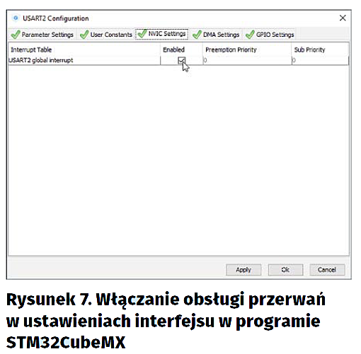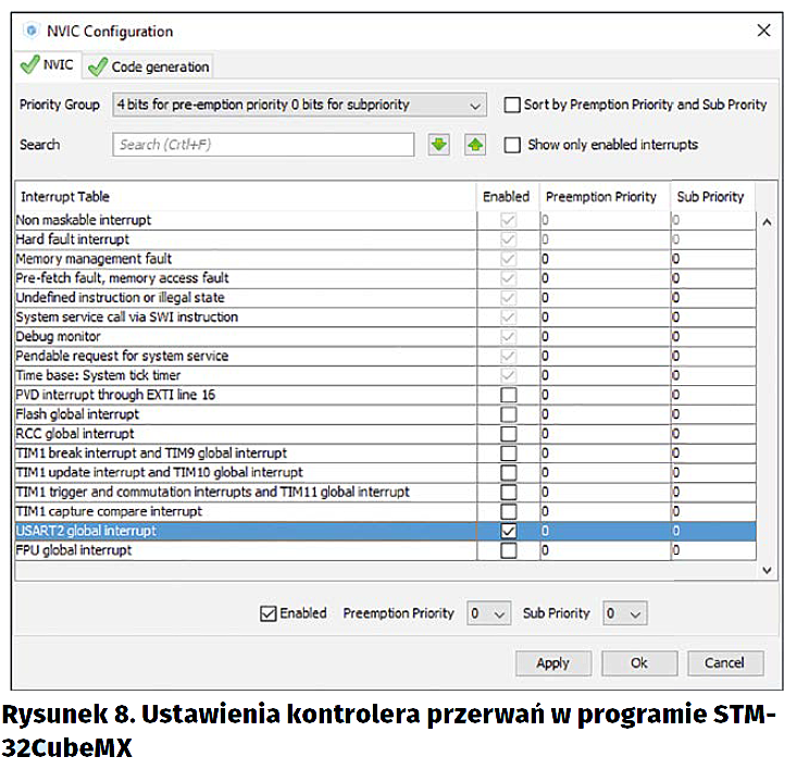 Aby uruchomić generowanie przerwań przez interfejs UART, wracamy do programu STM32CubeMX i wczytujemy w nim nasz projekt. Następnie przechodzimy do zakładki Configuration i wybieramy interfejs USART z sekcji Connectivity. W nowootwartym oknie przechodzimy do zakładki NVIC Settings i zaznaczamy jedynego checkboxa na liście (w polu Enable – rysunek 7). Alternatywnie, w zakładce Configuration, moglibyśmy wybrać opcje NVIC – wtedy wyświetli nam się lista wszystkich możliwych do uruchomienia w danym projekcie przerwań. Możemy tam także ustawiać ich priorytety (rysunek 8).