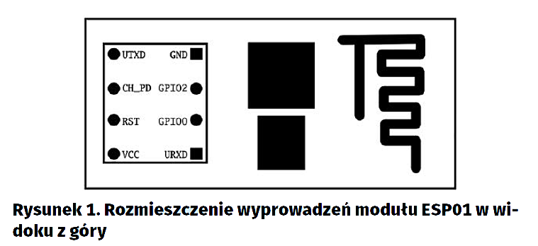 Moduły Wi-Fi z układem ESP8266 są oferowane w różnych wariantach wykonania. Główne różnice polegają na odmiennej liczbie dostępnych wyprowadzeń I/O, obecności zintegrowanej anteny, różnych wymiarach płytki i wykonaniu. W tekście będę odwoływał się do najprostszego, oznaczonego jako ESP01, ze zintegrowaną anteną wykonaną w postaci ścieżki na płytce drukowanej. Na rysunku 1 pokazano rozmieszczenie wyprowadzeń modułu ESP01 w widoku z góry.