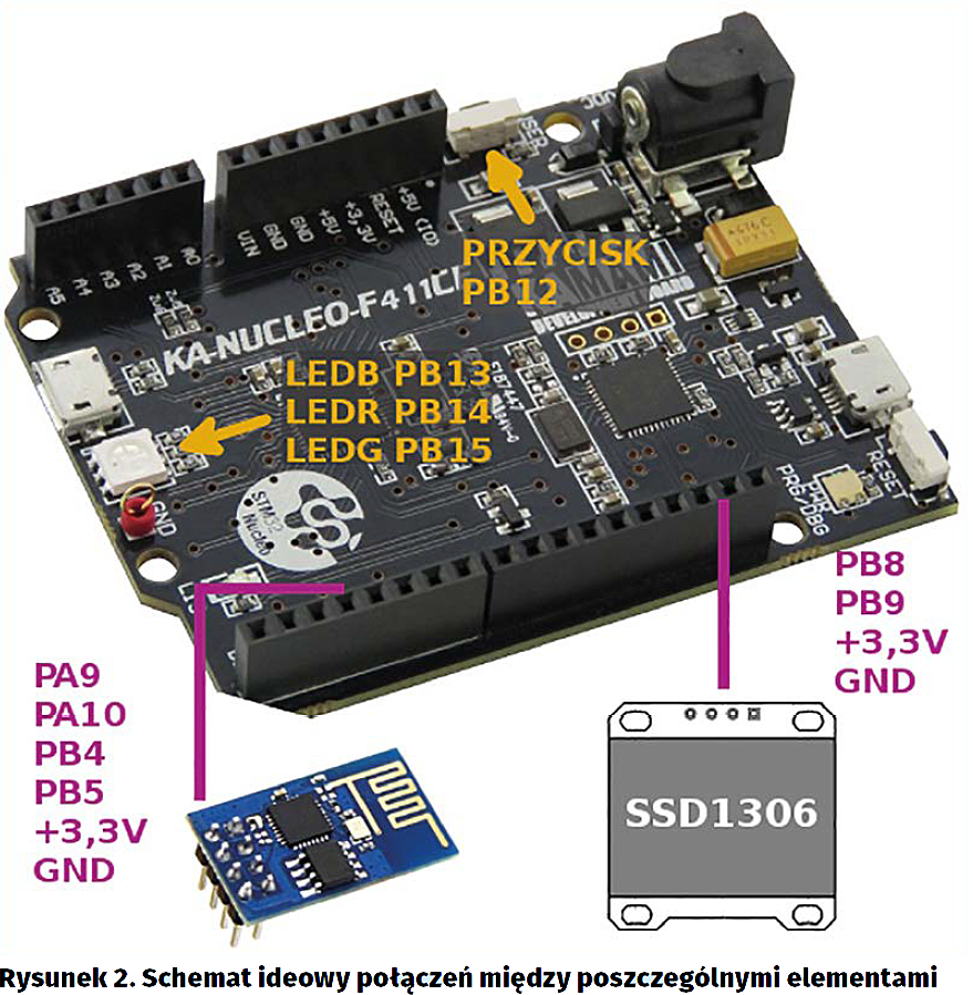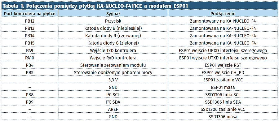 Do testów wykorzystana została płytka KA-NUCLEO-F411CE, miniaturowy wyświetlacz SSD1306 i oczywiście moduł ESP01. Płytka KA-NUCLEO-F411CE okazała się wygodna w użyciu, ze względu na zamontowaną potrójną diodę LED, którą będziemy sterować. Jednak można użyć dowolnej płytki ewaluacyjnej z kontrolerem STM. Wykaz użytych wyprowadzeń GPIO oraz dodatkowych połączeń umieszczono w tabeli 1, a na rysunku 2 pokazano schemat ideowy połączeń między poszczególnymi elementami układu.