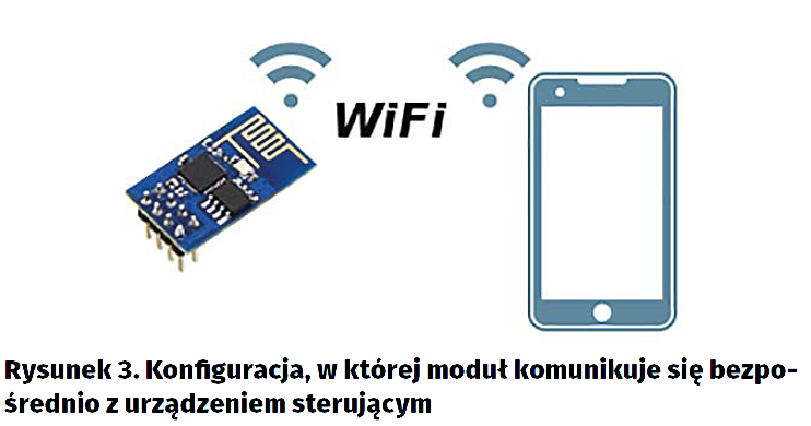 Na rysunku 3 pokazano konfigurację, w której moduł komunikuje się bezpośrednio z urządzeniem sterującym. Moduł skonfigurowany jako AP pracuje w trybie serwera. Do sterowania jest używany protokół http. Po odebraniu transmisji od klienta (np. z przeglądarki telefonu) sterownik połączony z modułem generuje dynamicznie stronę internetową zawierającą aktualny stan diod LED (zapalone lub zgaszone). Poprzez moduł ESP01 dane strony przesyłane są do telefonu. Tam wyświetlane na uruchomionej przeglądarce internetowej. Z poziomu przeglądarki można sterować włączeniem lub zgaszeniem wybranych diod.