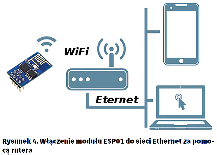 W podobny sposób korzystając z formularzy, prześlemy do sterownika nazwę SSID i hasło dostępu do rutera, z którego usług skorzystamy testując kolejną opcję trybu pracy modułu jako Stacji. W tej konfiguracji dostęp do modułu a poprzez niego sterowanie diodami będzie możliwe w obrębie sieci Ethernet, do której zostanie włączony za pośrednictwem rutera (rysunek 4). Ruter ethernetowy pracuje w sieci, do której są włączone również inne urządzenia. Do tej sieci poprzez, łącze Wi-Fi rutera, jest włączony także moduł ESP01. Moduł pracuje w trybie Stacja, a ruter pełni funkcję punktu dostępowego AP.