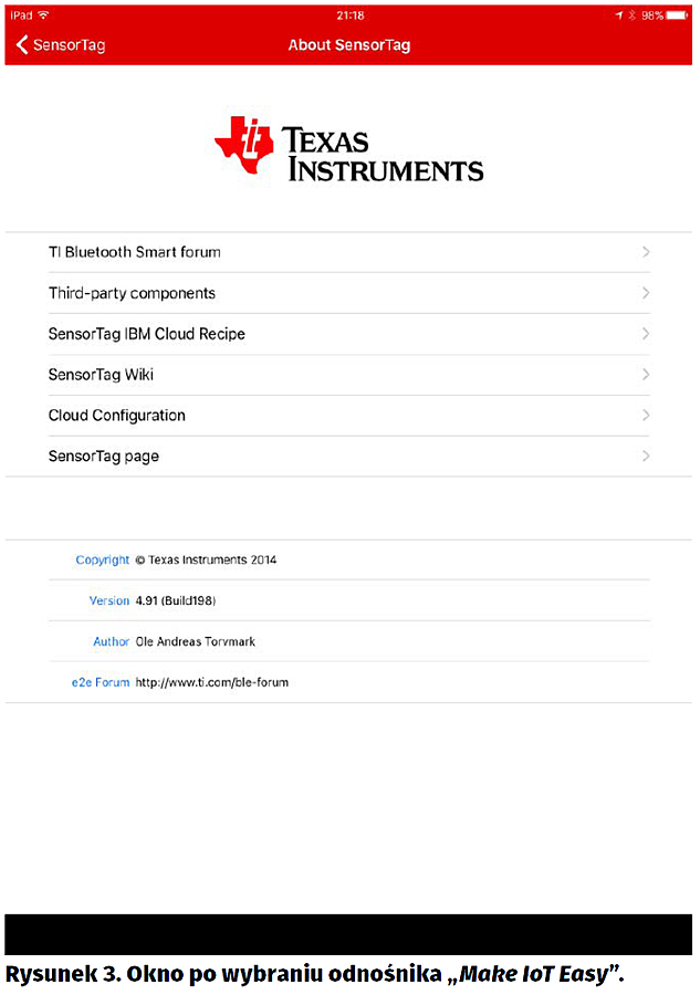 W głównym oknie aplikacji SensorTag jest odnośnik „Make IoT Easy” (rysunek 2). Otwiera on okno About SensorTag z grupą odnośników do różnych przydatnych stron oraz daje możliwość skonfigurowania chmury. Na dole okna są informacje o wersji aplikacji (rysunek 3). W głównym oknie aplikacji SensorTag wyszukaj na liście „Bluetooth Smart Devices” swój zestaw SensorTag. Po kliknięciu na niego pojawia się okienko wyboru (rys. 2). Kliknij na „Sensor View”. Pojawia się okno prezentujące bieżące wartości odczytu z czujników. Zielona dioda LED zestawu CC2650 SensorTag przestaje błyskać. Oznacza to, że zestaw jest w stanie komunikacyjnym „połączony”. Niestety wygląda to tak samo jak w stanie uśpienia urządzenia.