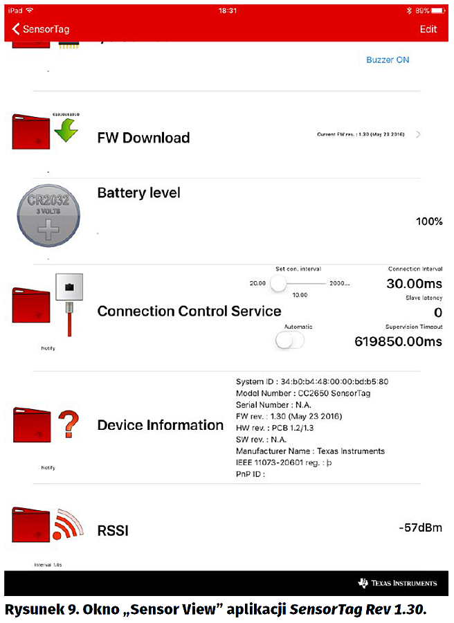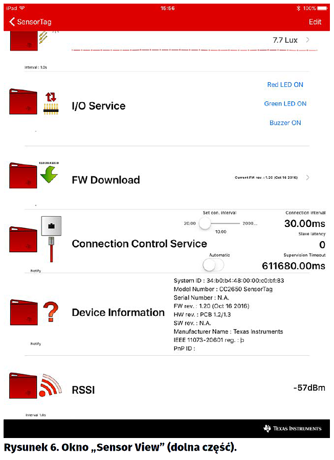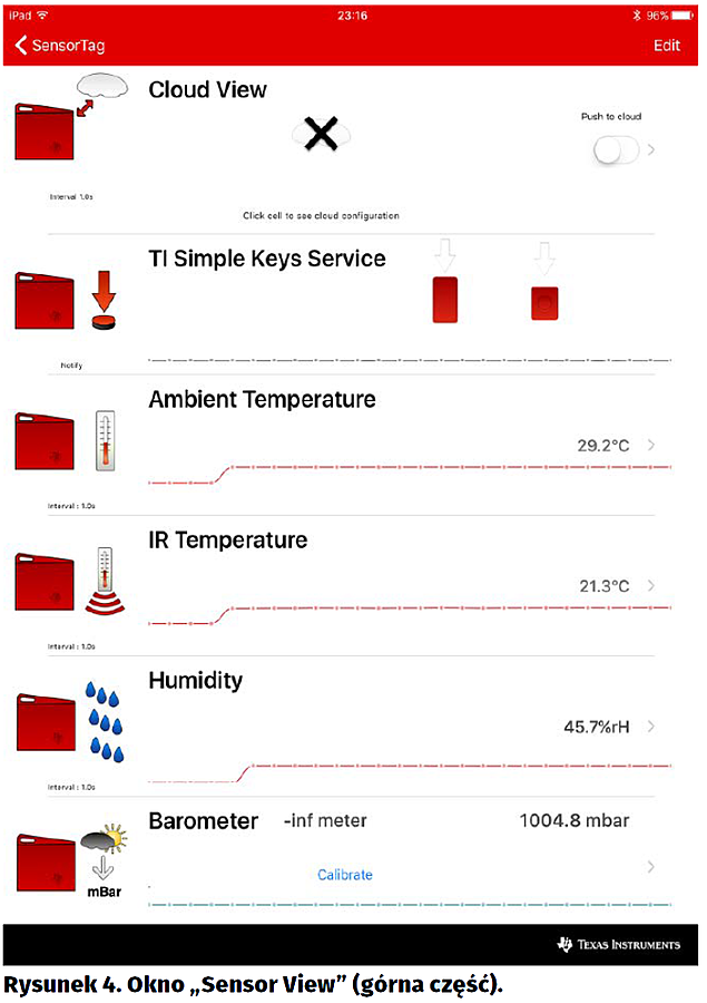 Na stronie TI można spotkać oprogramowanie SimpleLink SensorTag Software będące bardzo wczesnymi wersjami (z końca roku 2015). Na zakładce Teardown strony „IoT made easy” [7] są odnośniki do pobrania aktualnej wersji obu wersji aplikacji a także do ich kodów źródłowych.