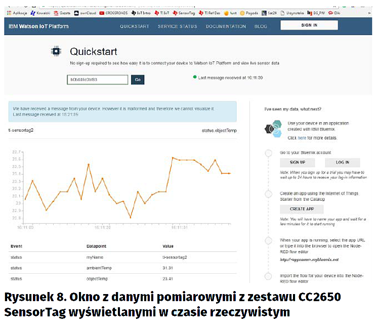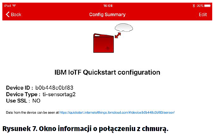 Kliknięcie na ikonę chmury otwiera okno „Config Summary” (rys. 7). Jako identyfikator urządzenia jest brany unikalny adres MAC zestawu CC2650 SensorTag. W oknie jest podany adres dostępu do strony Internetowej Quickstart z danymi pomiarowymi pobieranymi z zestawu CC2650 SensorTag i wyświetlanymi na bieżąco (w czasie rzeczywistym) [11].
