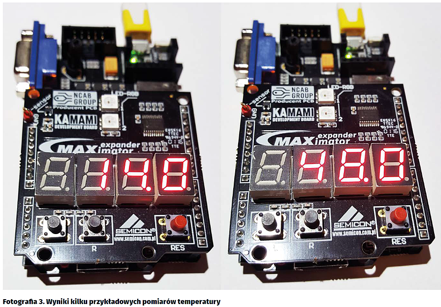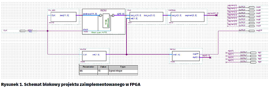 Blok my_adc przekazuje cyfrową wartość odpowiadającą zmierzonej temperaturze do bloku ROM, który przelicza ją na wartość w skali Celsjusza zapisaną w kodzie BCD. Moduł mux wybiera pojedynczą cyfrę z kodu BCD przekazuje ją do bloku bcd2seg, który zapisuje cyfrę w notacji 7-segmentowej. Moduł counter opóźnia multipleksowanie oraz służy do wybierania liczb do wyświetlenia. Moduł demux, na podstawie wartości otrzymanej z bloku counter wybiera odpowiedni wyświetlacz, na którym wyświetlona zostaje cyfra.